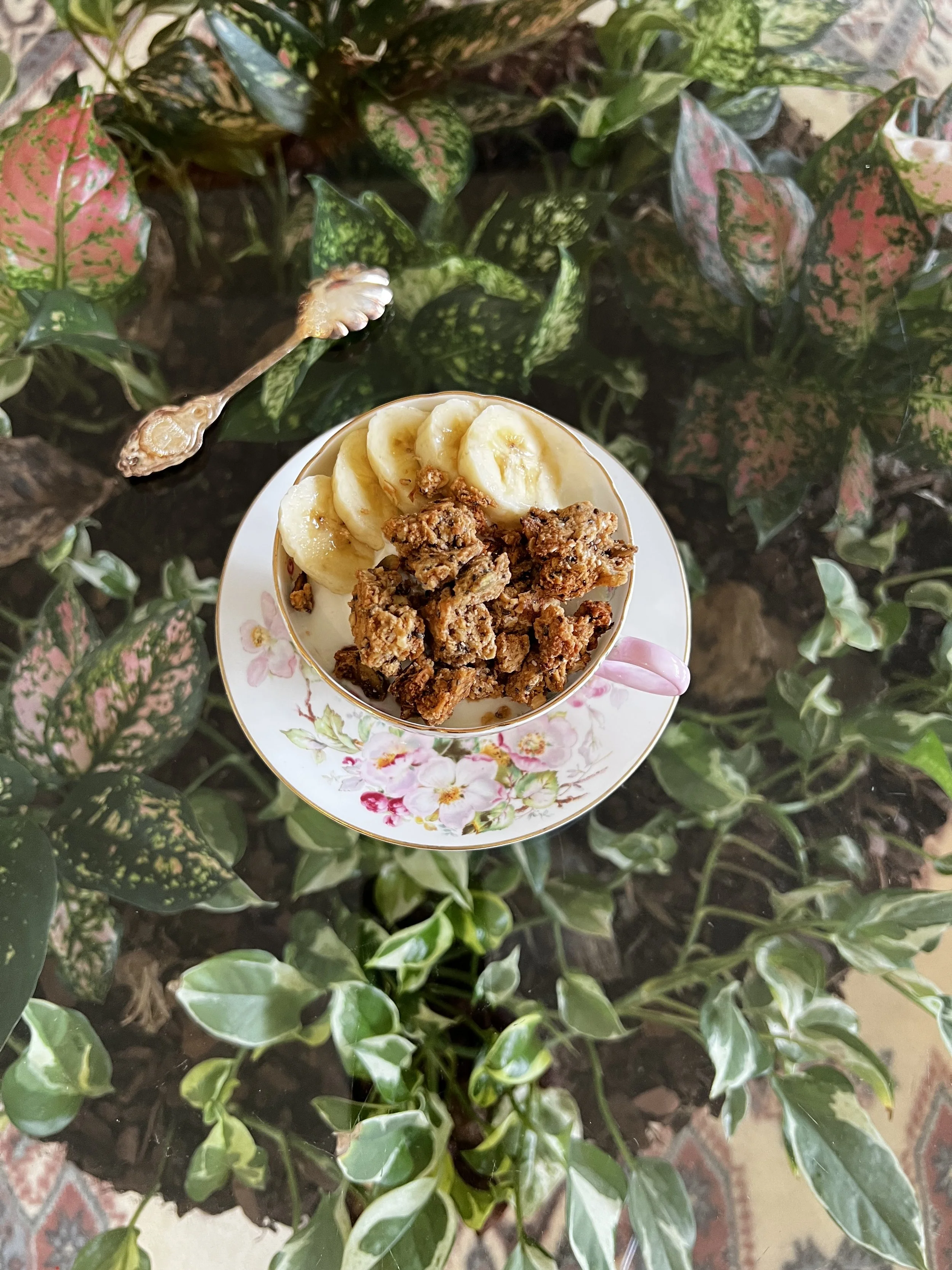To make the chia jam place frozen raspberries with a splash of water in a small saucepan and place over low heat until defrosted. Add chia seeds and stir for a couple of minutes until chia seeds swell up and mixture forms a gel. Add honey to taste.